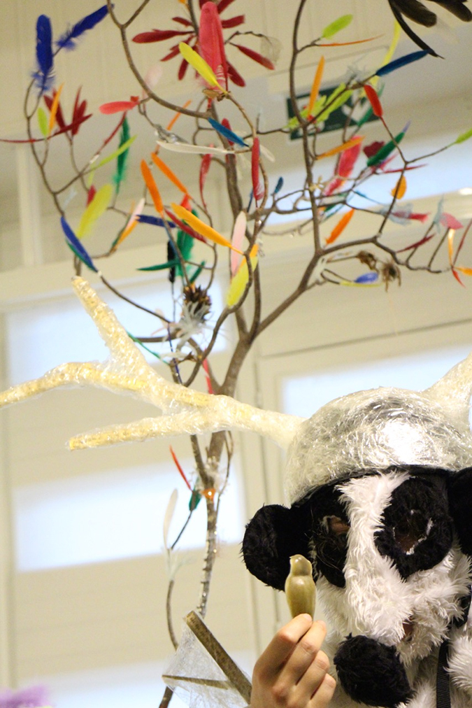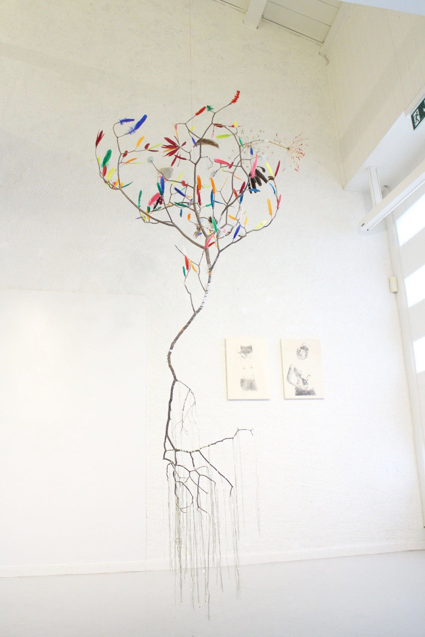 mobile, végétaux, plumes, débris divers, fil de pêche, 150 x 40 cm, 2015