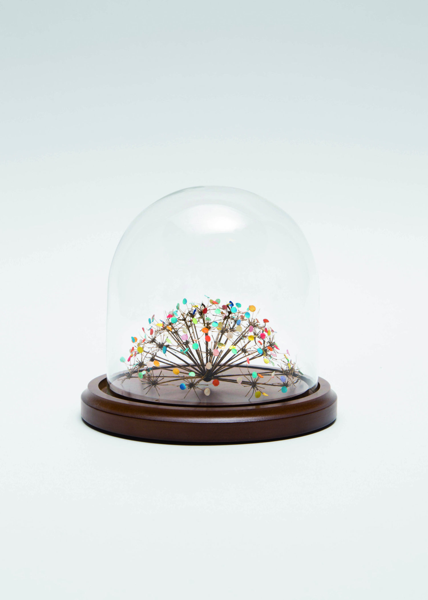 Collage, ombellifère, confettis, cloche en verre, socle en bois